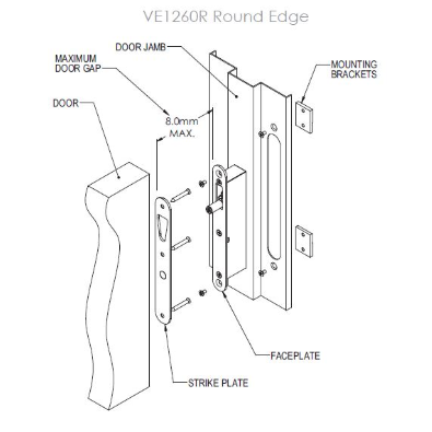 The patented VE1260 is a high torque motor driven drop bolt with up to 35kg pre-load/side load tolerance. It can be installed vertically in the door frame (lock style) or horizontally in the frame header and has a symmetric dead-bolt mechanism to allowing it to be used on 180° degree swing through doors.
